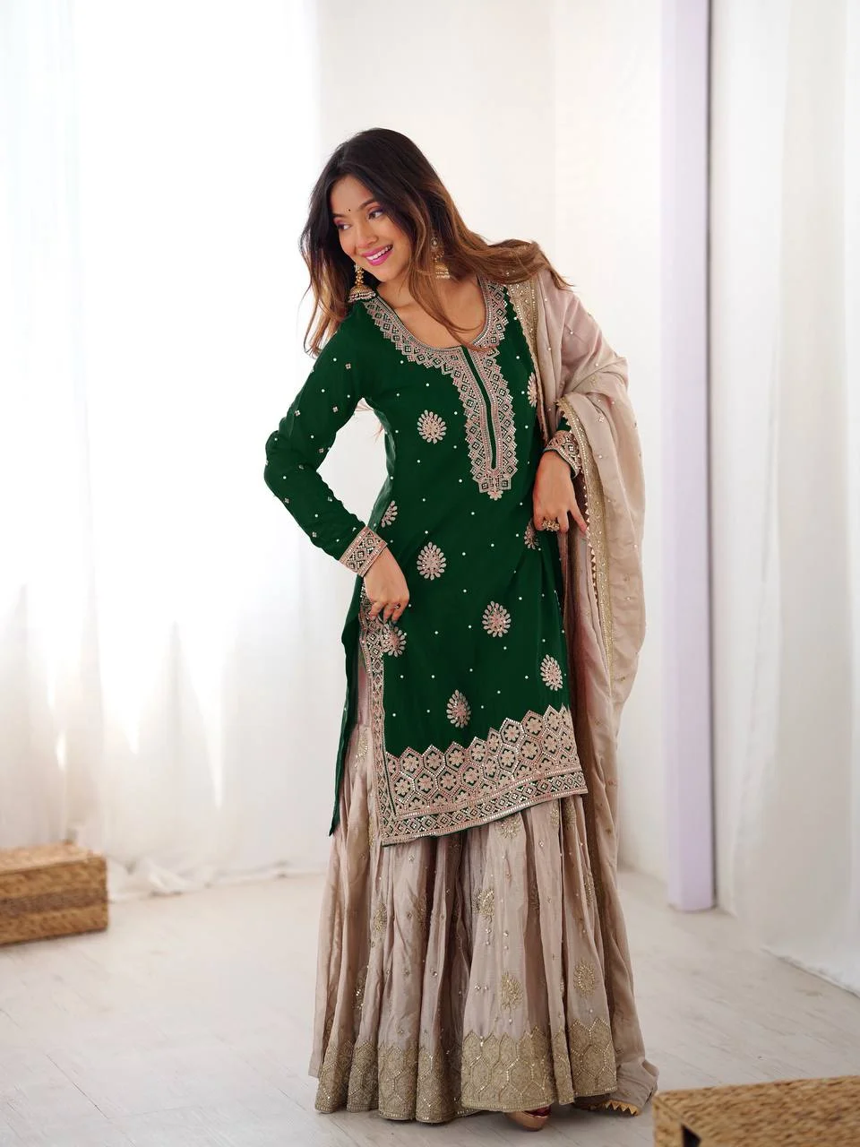 Select options This product has multiple variants. The options may be chosen on the product pageGraceful Green Chinon Silk Eid Sharara Set with Pearl Detailing