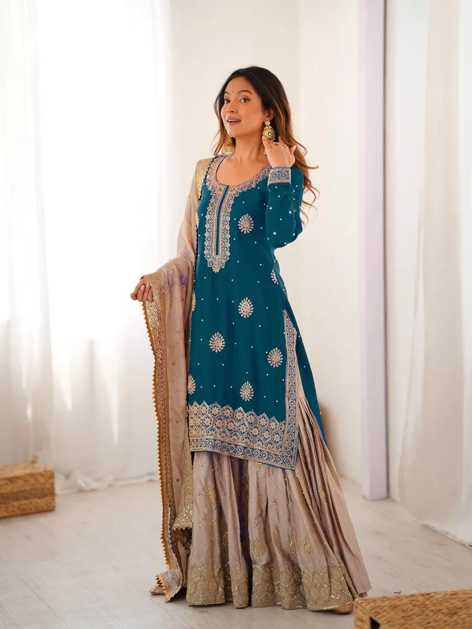 Select options This product has multiple variants. The options may be chosen on the product pageElegant Teal Blue Co-ord Set- Western Dhoti & Designer Choli With Sequence Shrug