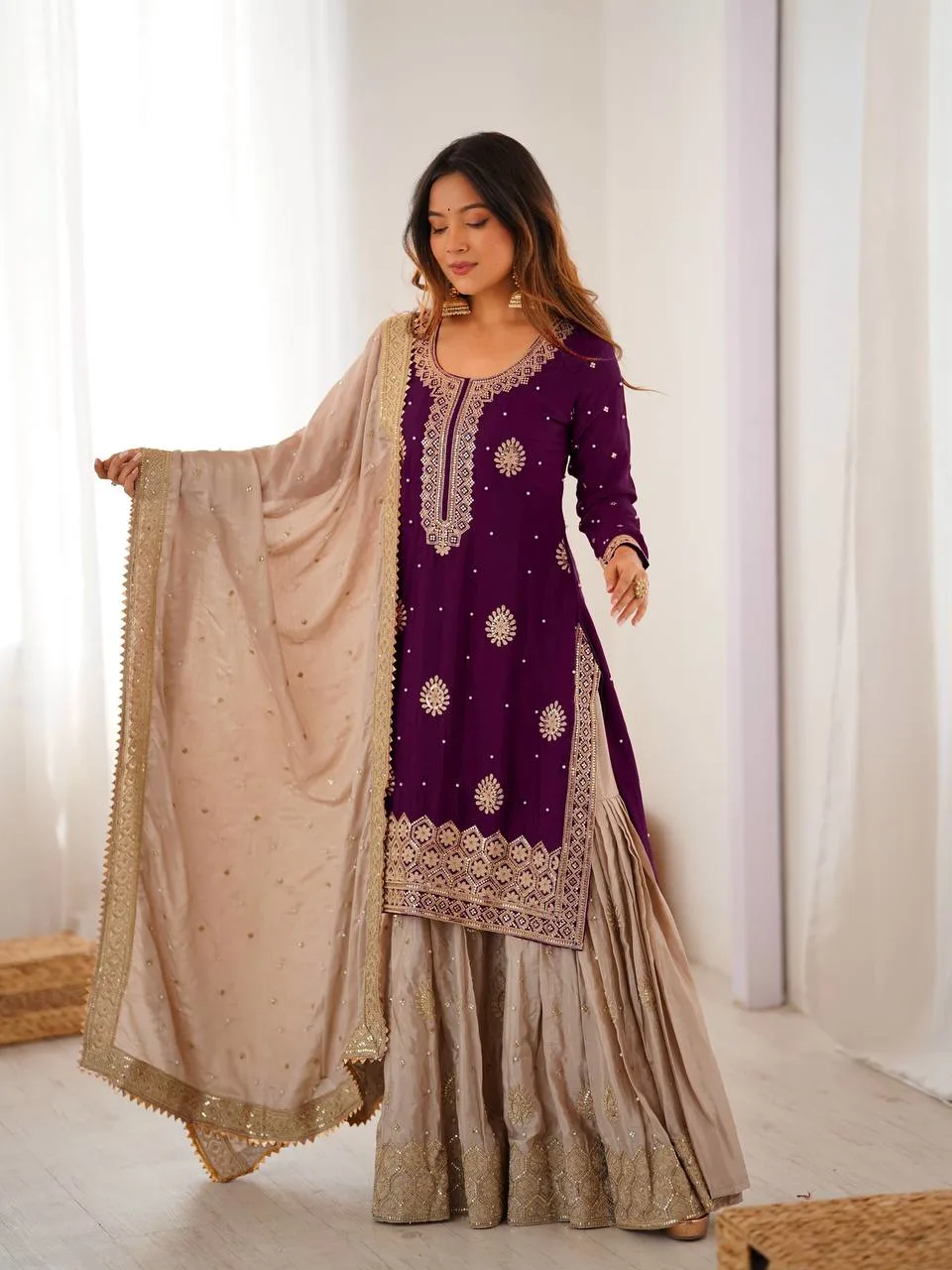 Select options This product has multiple variants. The options may be chosen on the product pageRoyal Purple Chinon Silk Sharara Set with Pearl Embroidery
