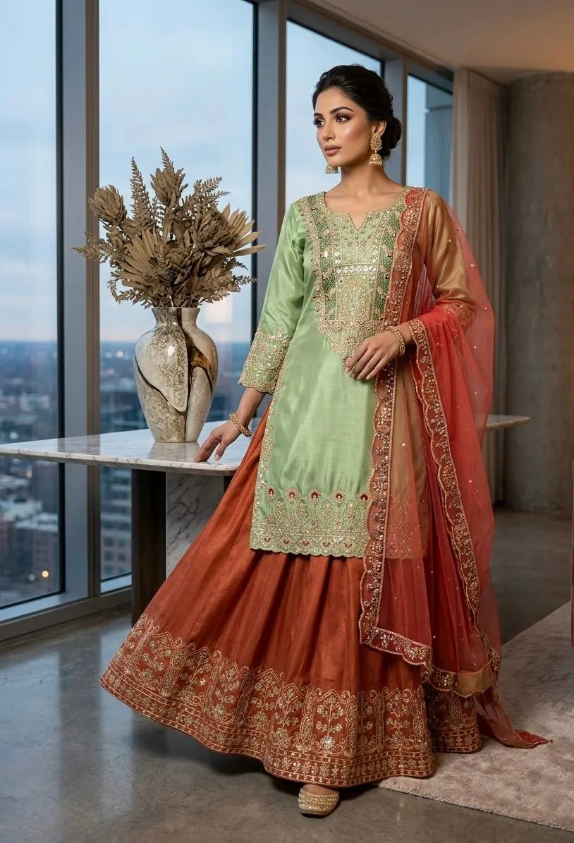Select options This product has multiple variants. The options may be chosen on the product pageRed Chinon Silk Peplum Kurti with Heavy Embroidery and Flared Lehenga Set for Women