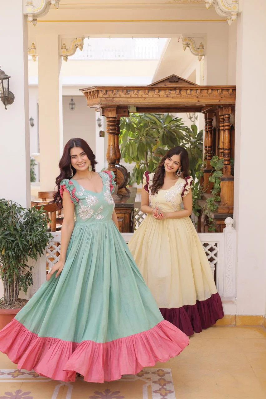 Party Wear Cotton Embroidered Gown with Double Frill Sleeves