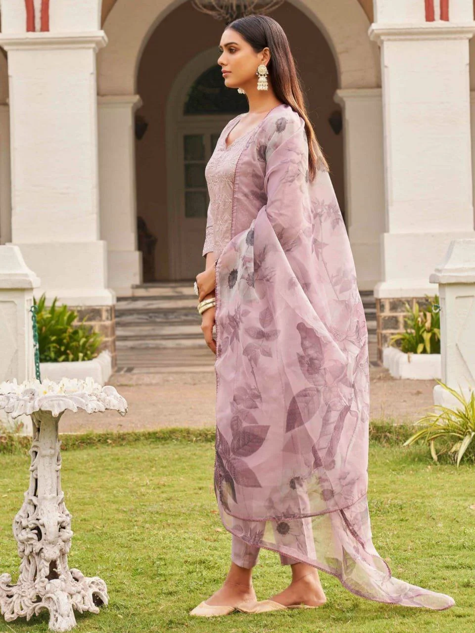 Premium Roman Fabric Suit Set with Embroidery Work & Organza Dupatta
