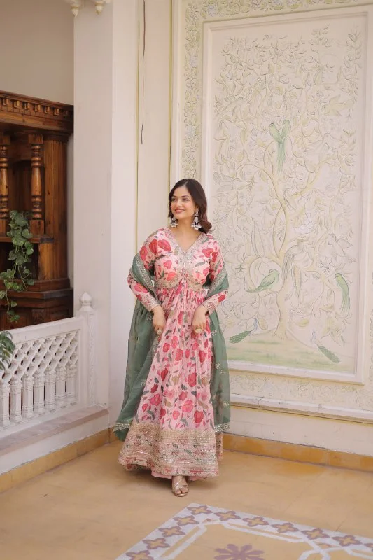 Flared Russian Silk Gown with Digital Print & Embroidery