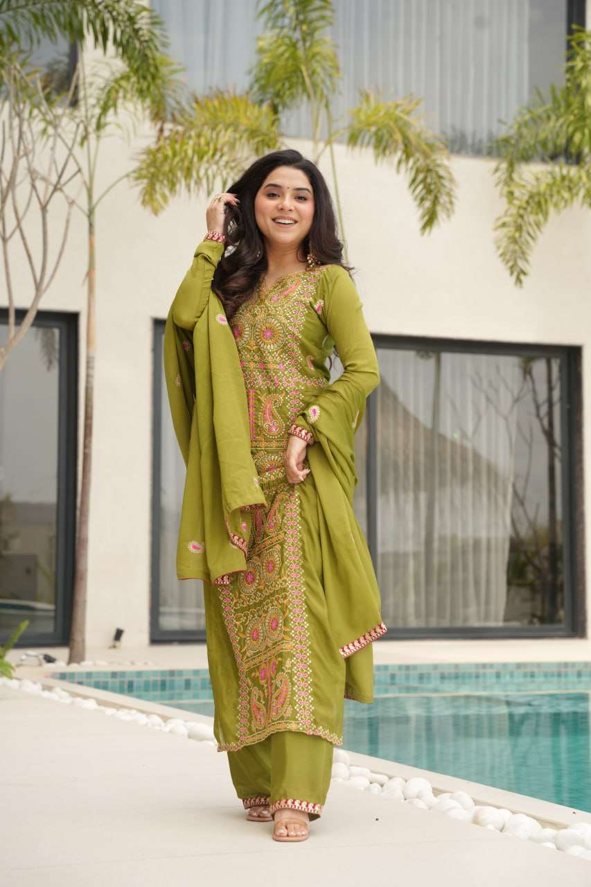 Timeless Green Elegance : Chinnon Embroidered Three-Piece Set
