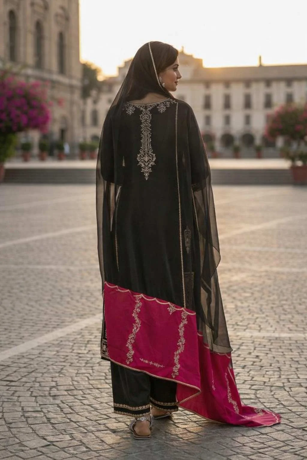 • Traditional Black Natural Crepe Silk Top Bottom Suit with Lace Work Dupatta50% OFF