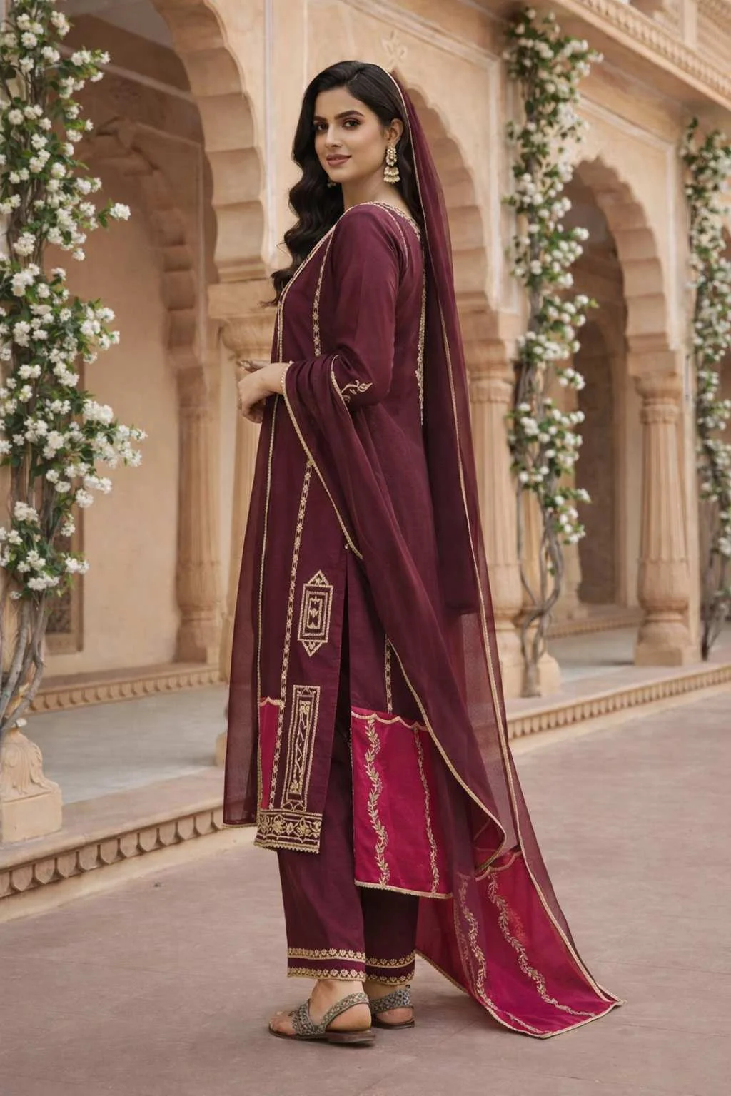 Luxury Maroon GMY Silk Sequence Embroidered Plazzo Suit Set
