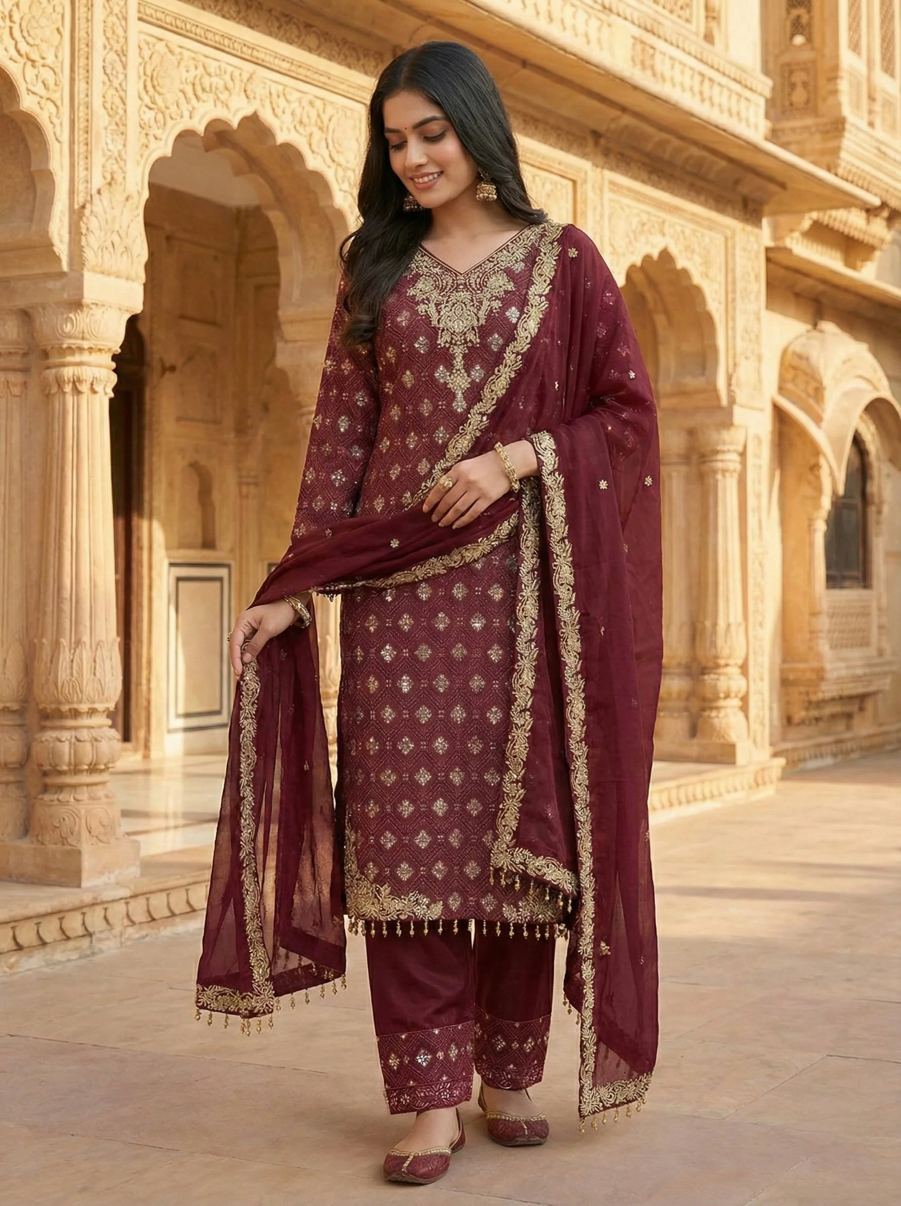 • Designer Crunchy Silk Suit Set with Heavy Sequin Embroidery50% OFF