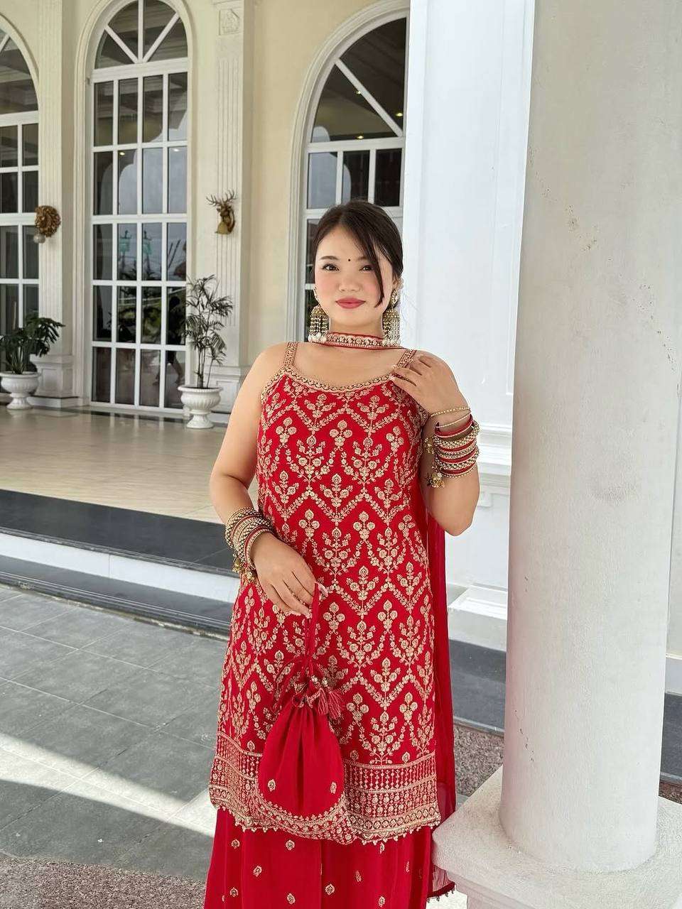 Classic Red Premium Plazzo Set – Embroidered Faux Georgette with Sequence Detailing