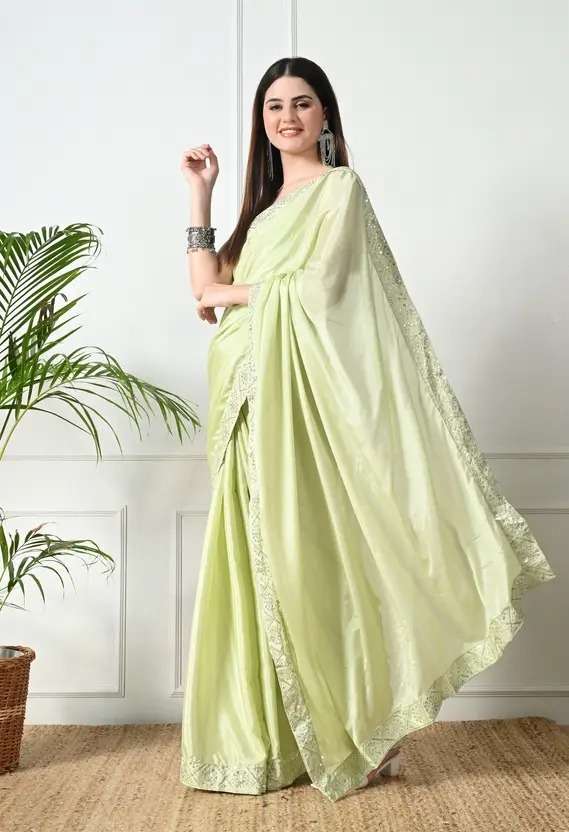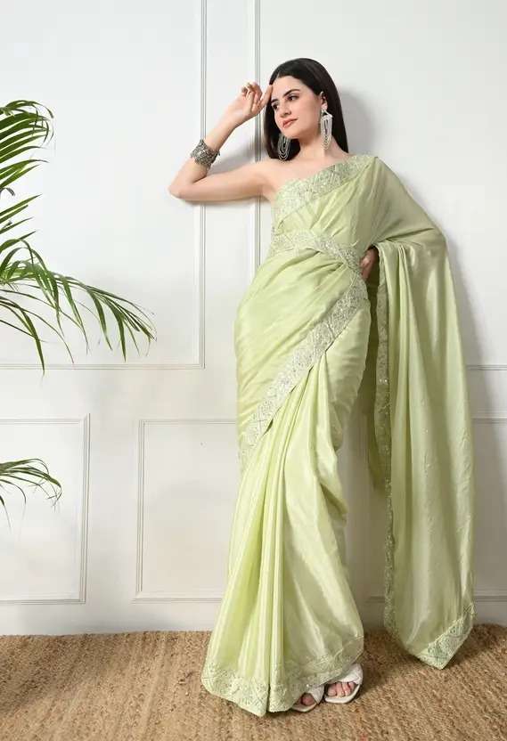 Light Green Embroidered Bollywood Chiffon Saree – Festive Glow in Every Drape