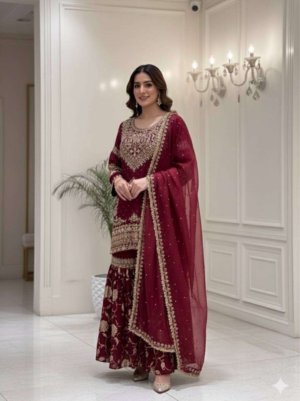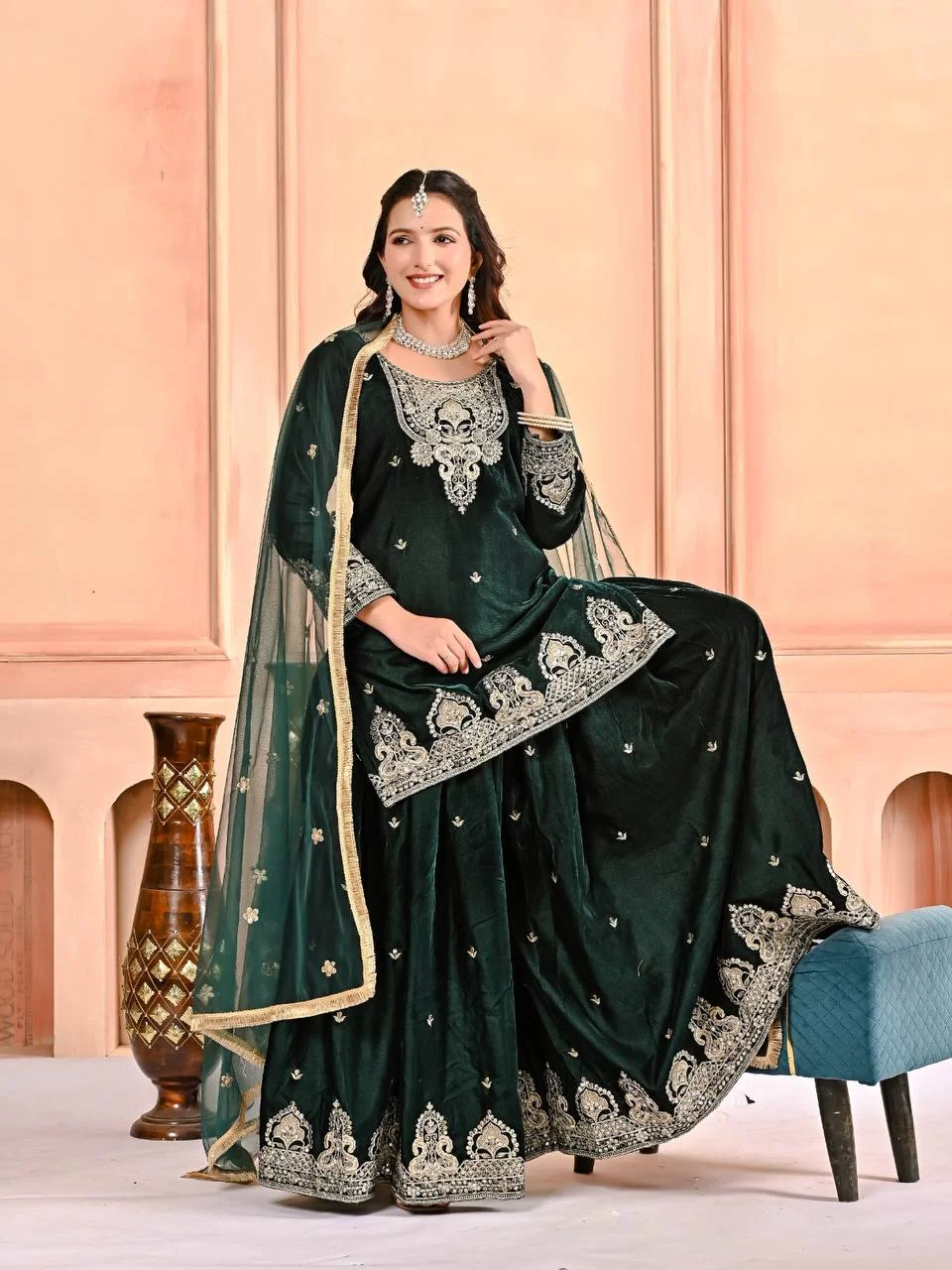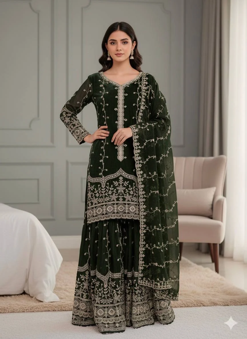 Fully Stitched Velvet Sharara Suit with Heavy Work & Fancy Lace Dupatta