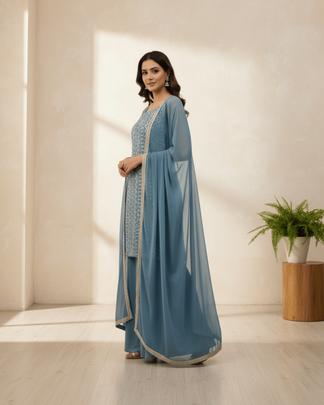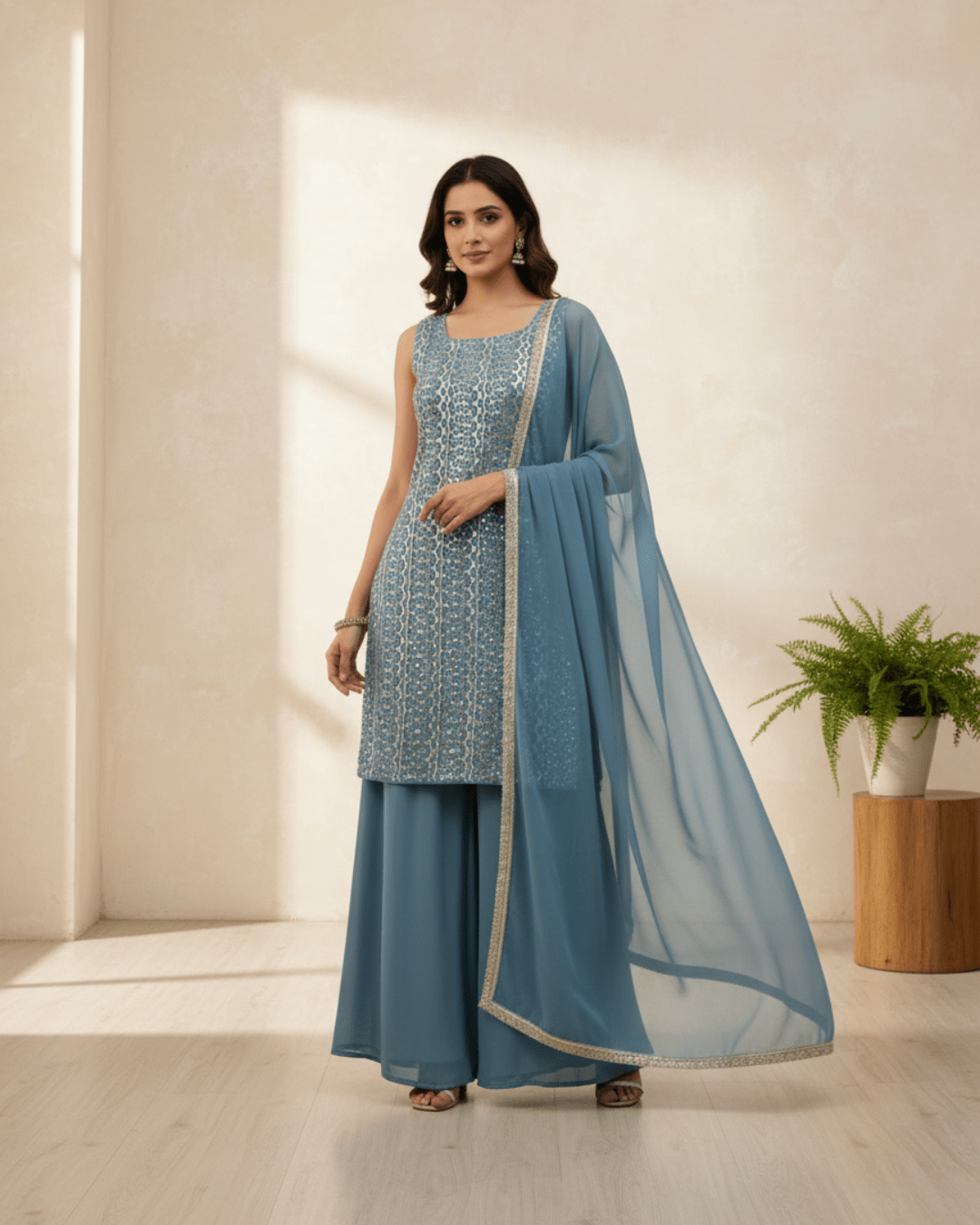 Designer Bean Blue Top & Palazzo with Dupatta – Festive Elegance
