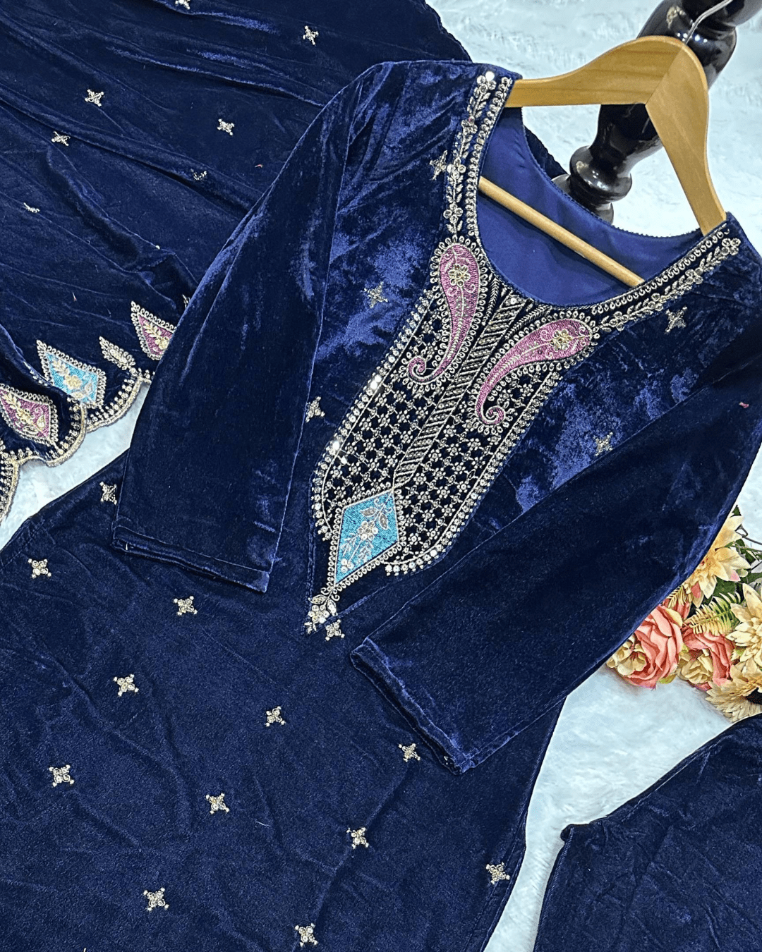 Designer Blue Velvet Suit – Heavy Embroidery with Dupatta & Pant | Elegant Ethnic Ensemble