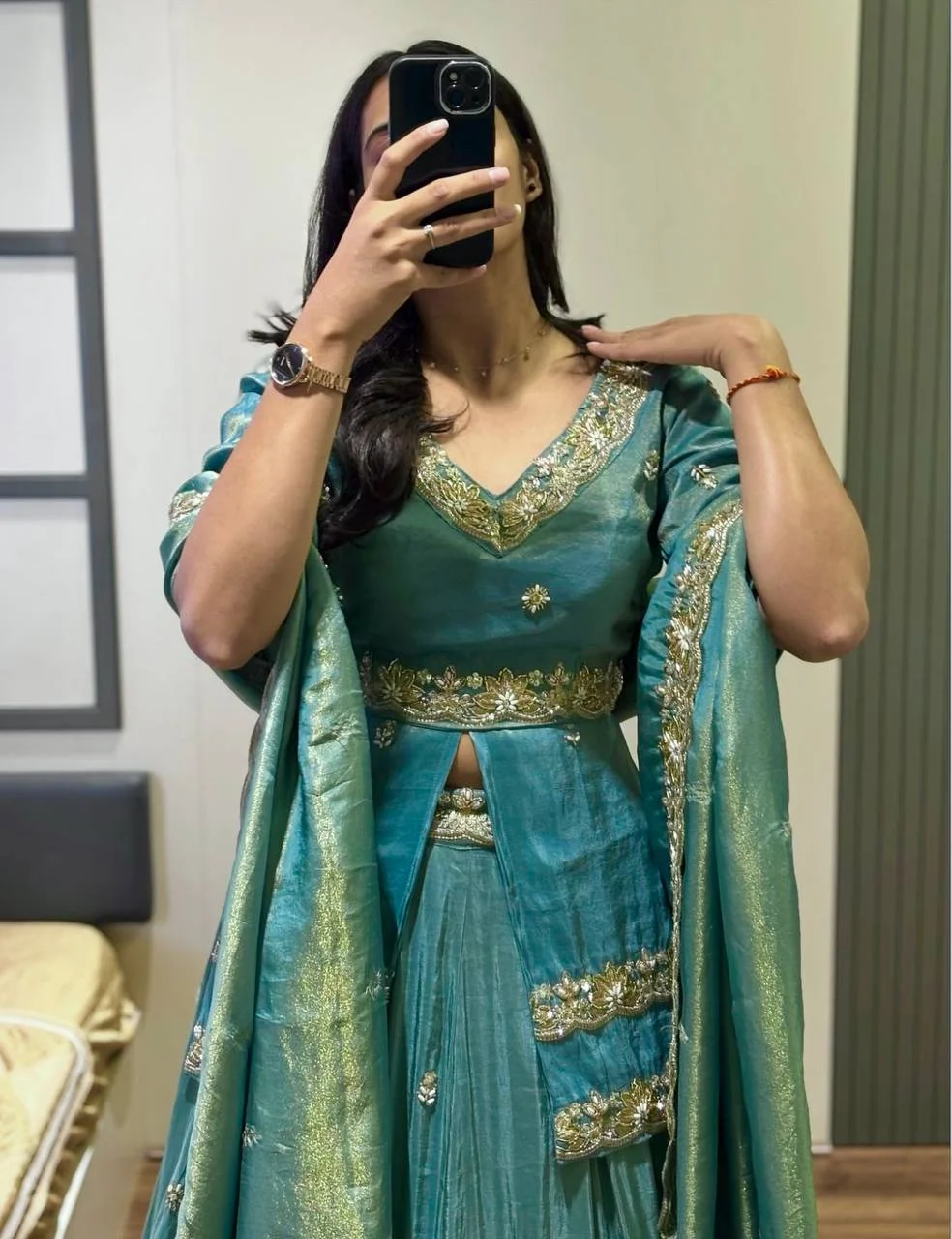 Green Gold Crush Embroidered Lehenga Set with Heavy Sequence & Zari Work