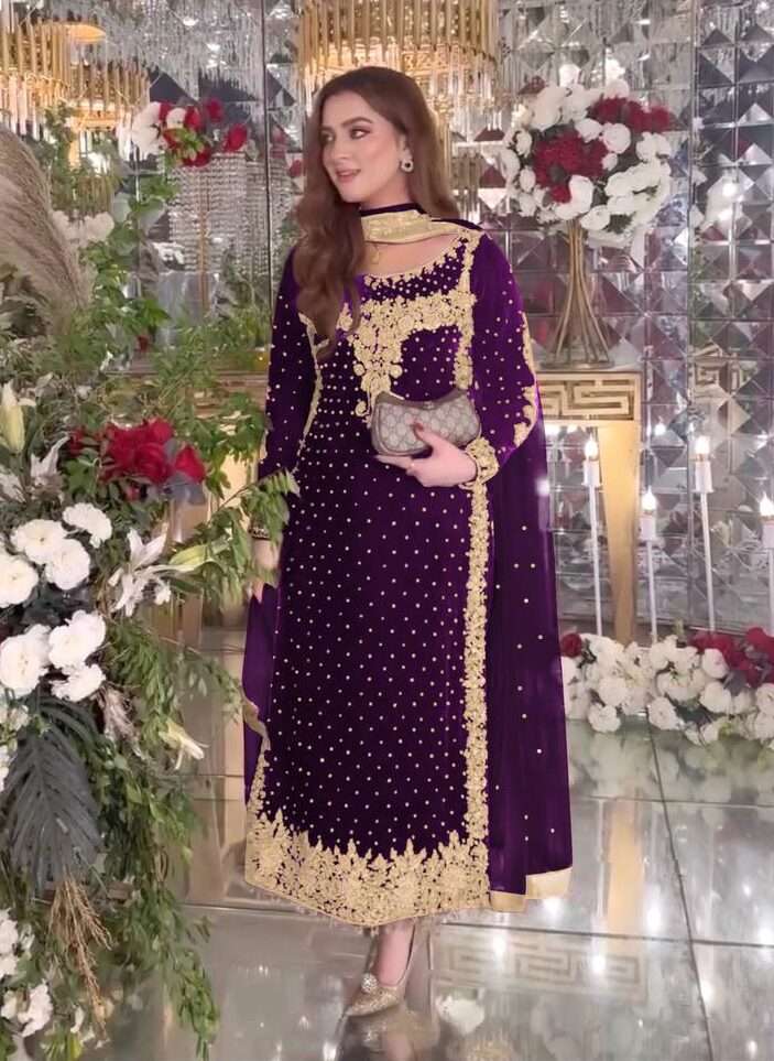 Luxury Purple Velvet Ensemble – Fully Stitched Party Wear with Embroidered Net Dupatta