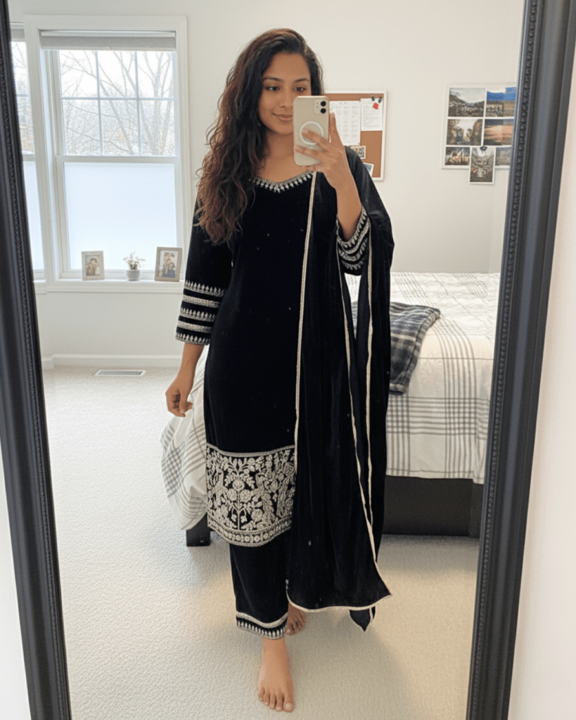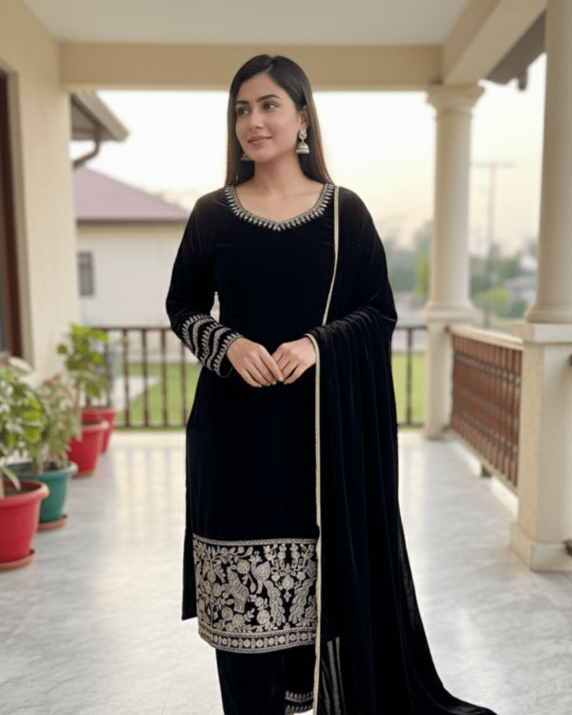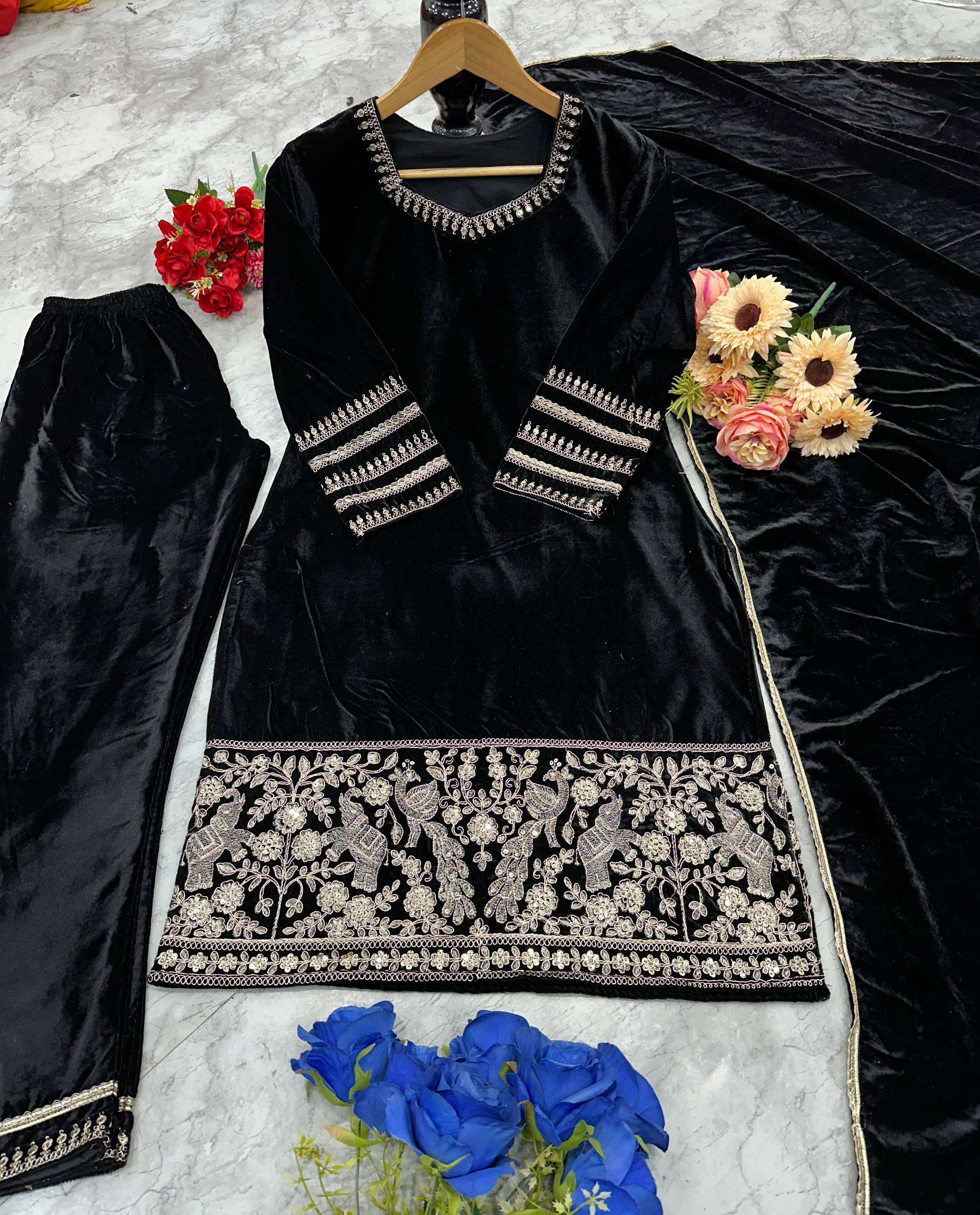 Black Velvet Party Wear Set – Heavy Embroidered Top, Pant & Dupatta