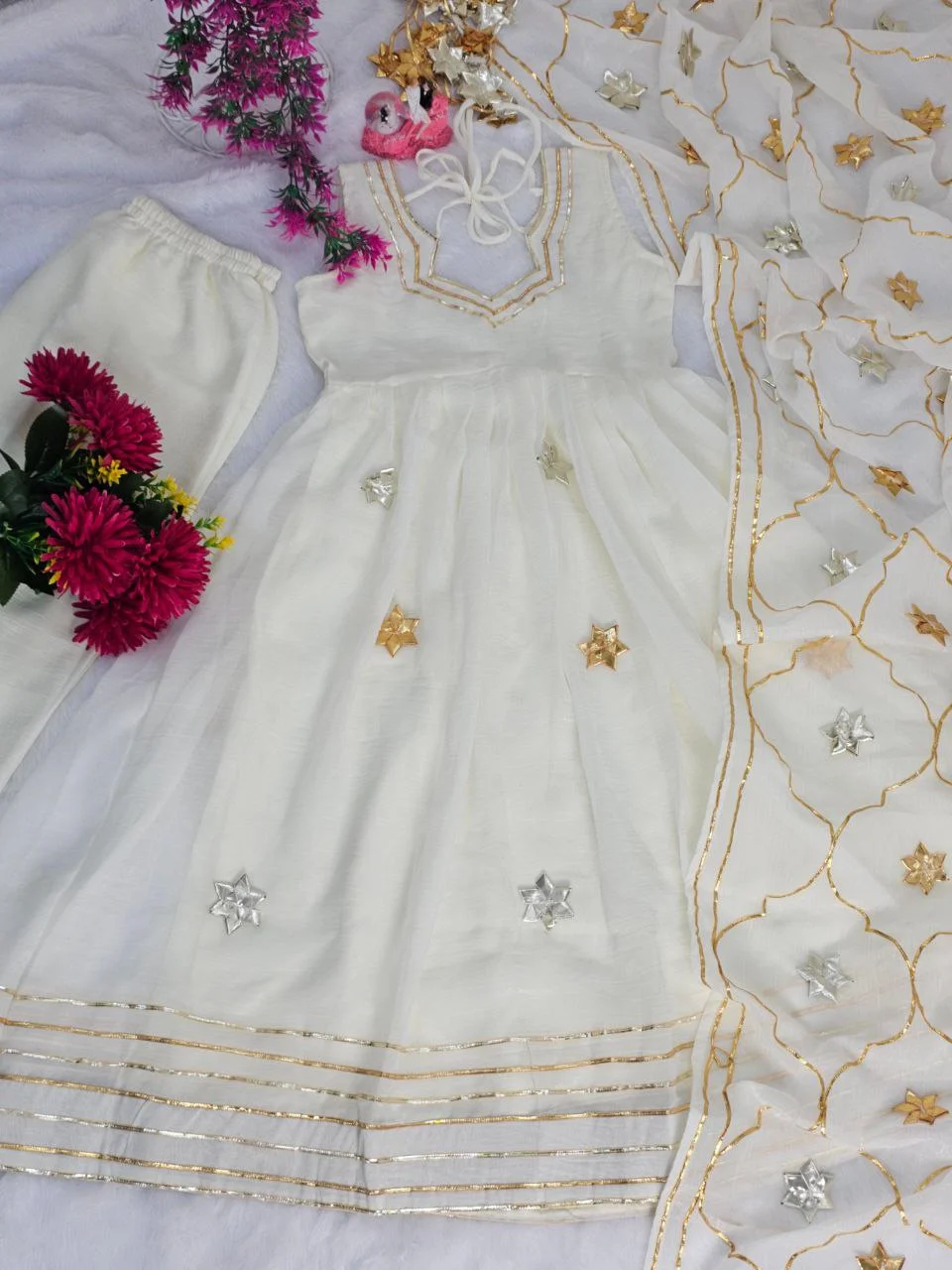 Chic White Anarkali Trio : Anarkali Plazzo with Dupatta