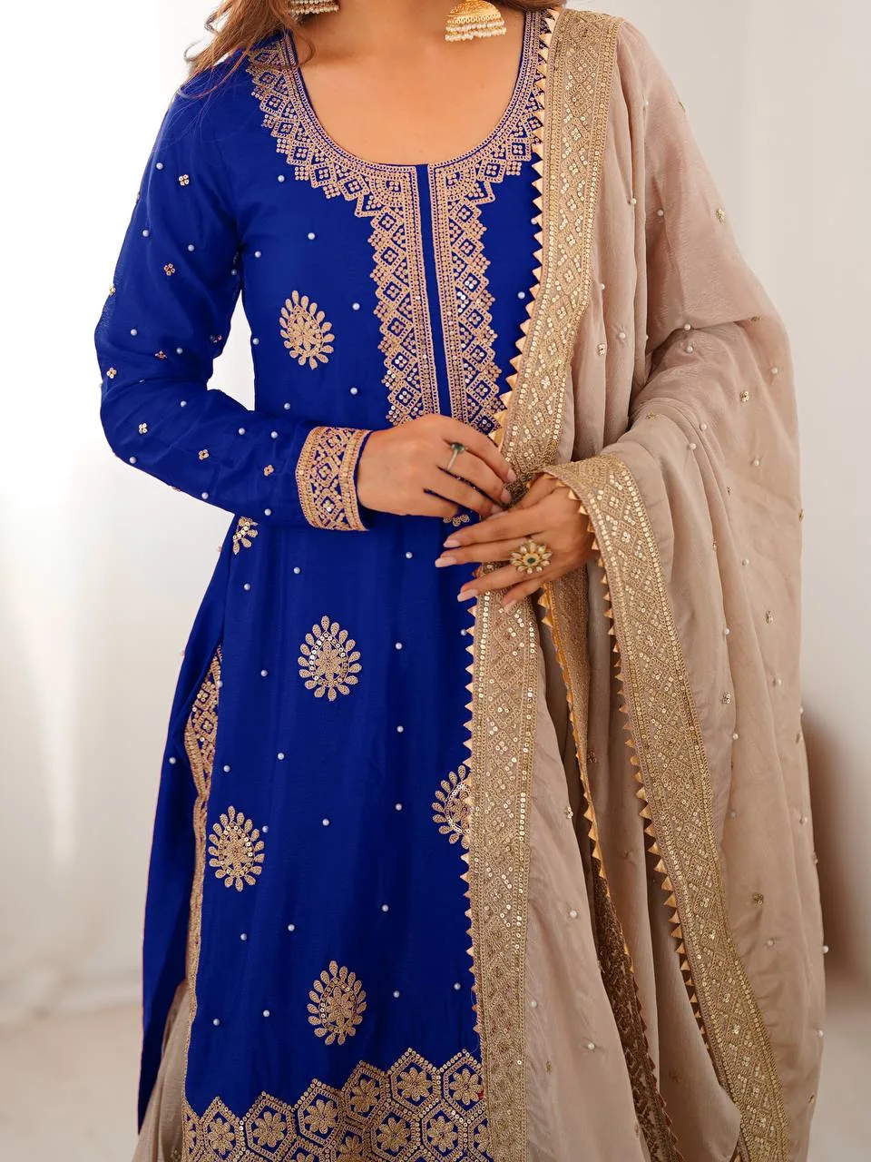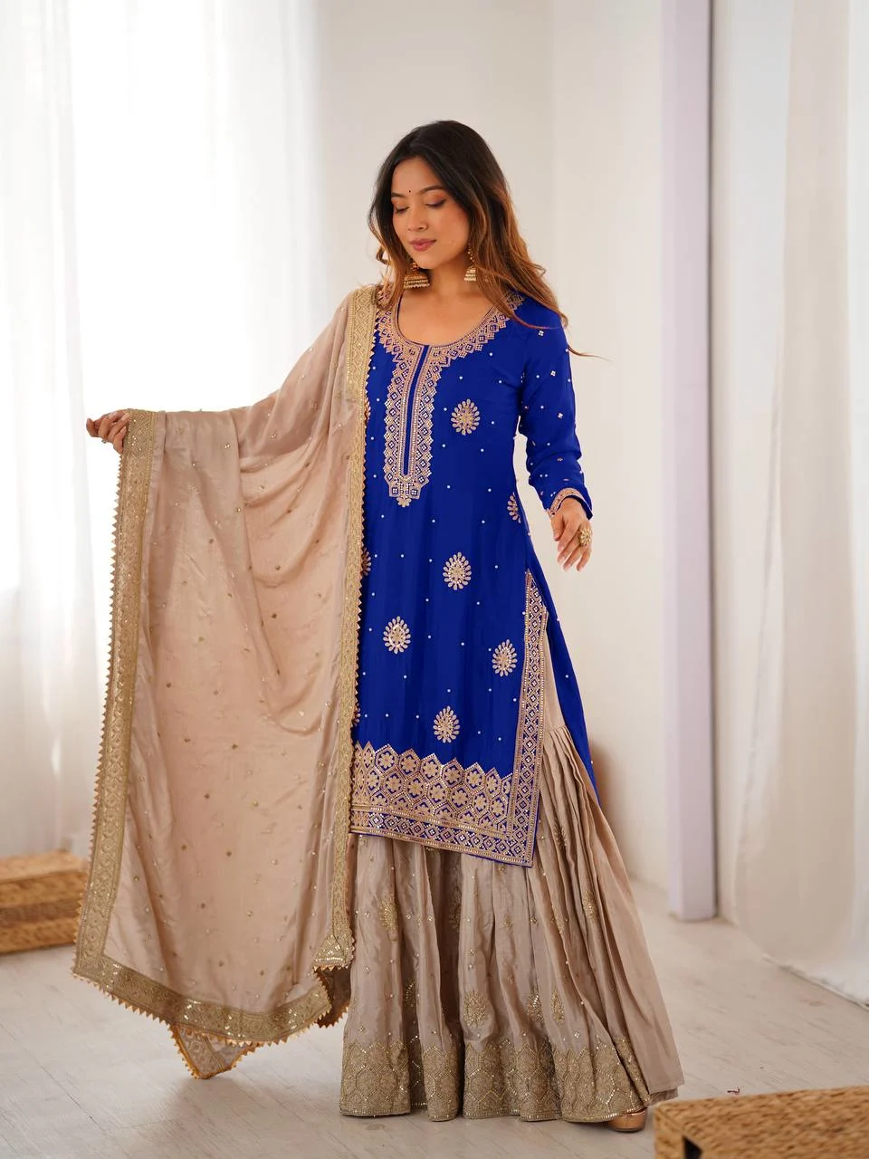Elegant Blue Kurti Sharara Set with Sequence & Pearl Work