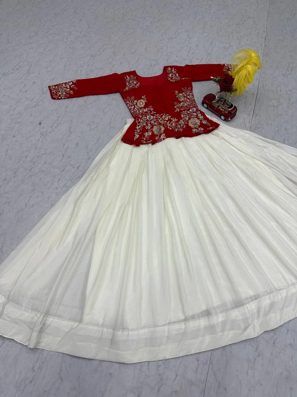 Elegant Red Chinon Lehenga Set with Fully Stitched Embroidered Blouse
