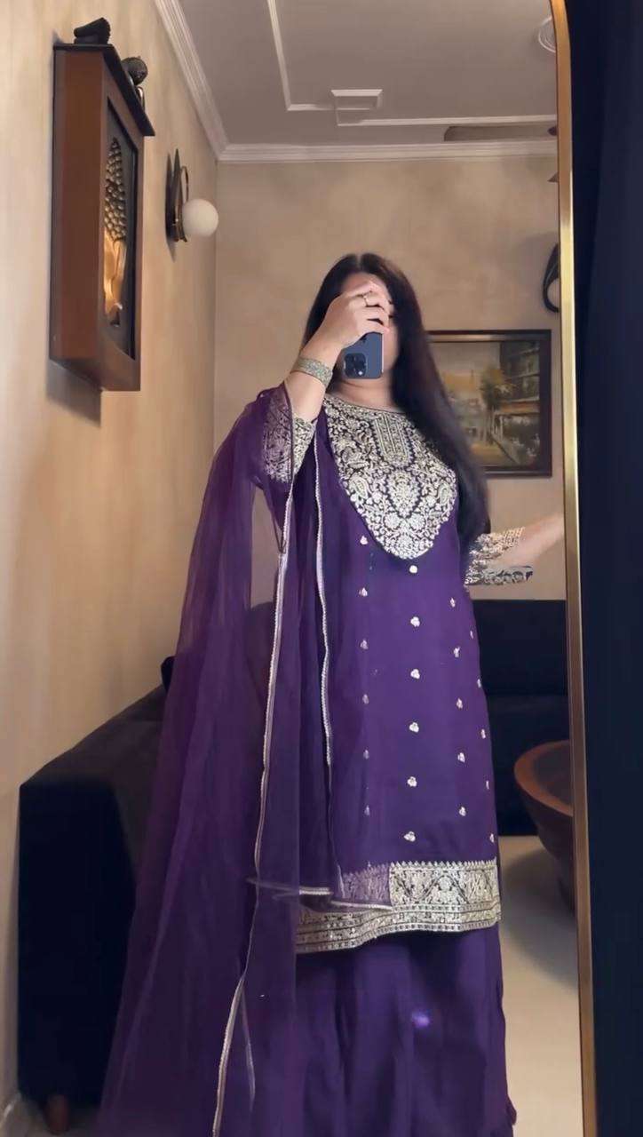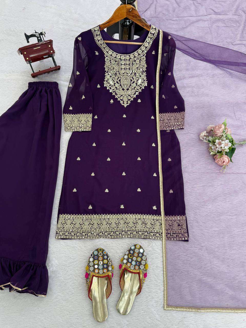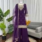 Be the first to review “Faux Georgette Coding Work Plazzo Set With Butterfly Net Dupatta”
