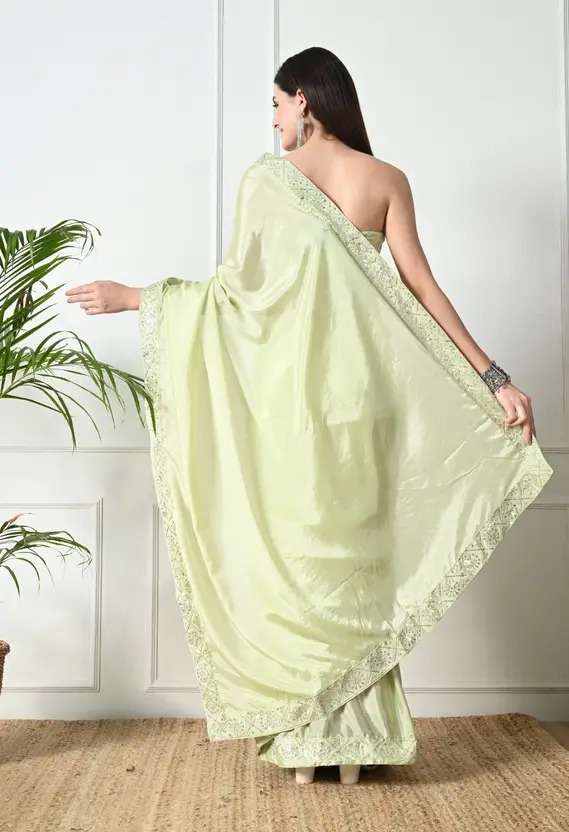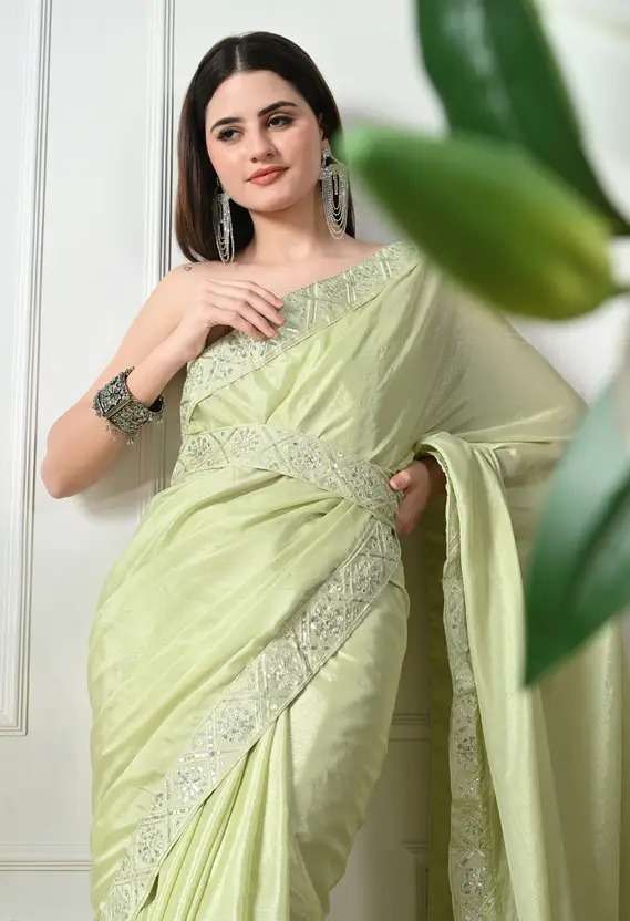Light Green Embroidered Bollywood Chiffon Saree – Festive Glow in Every Drape