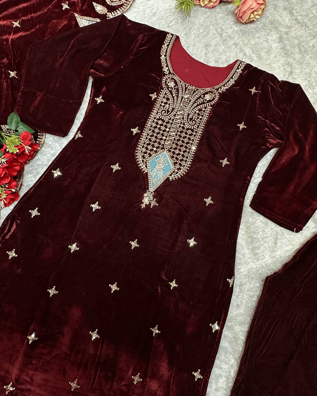 Maroon Velvet Embroidered Suit Set – Designer Top, Pant & Dupatta Combo