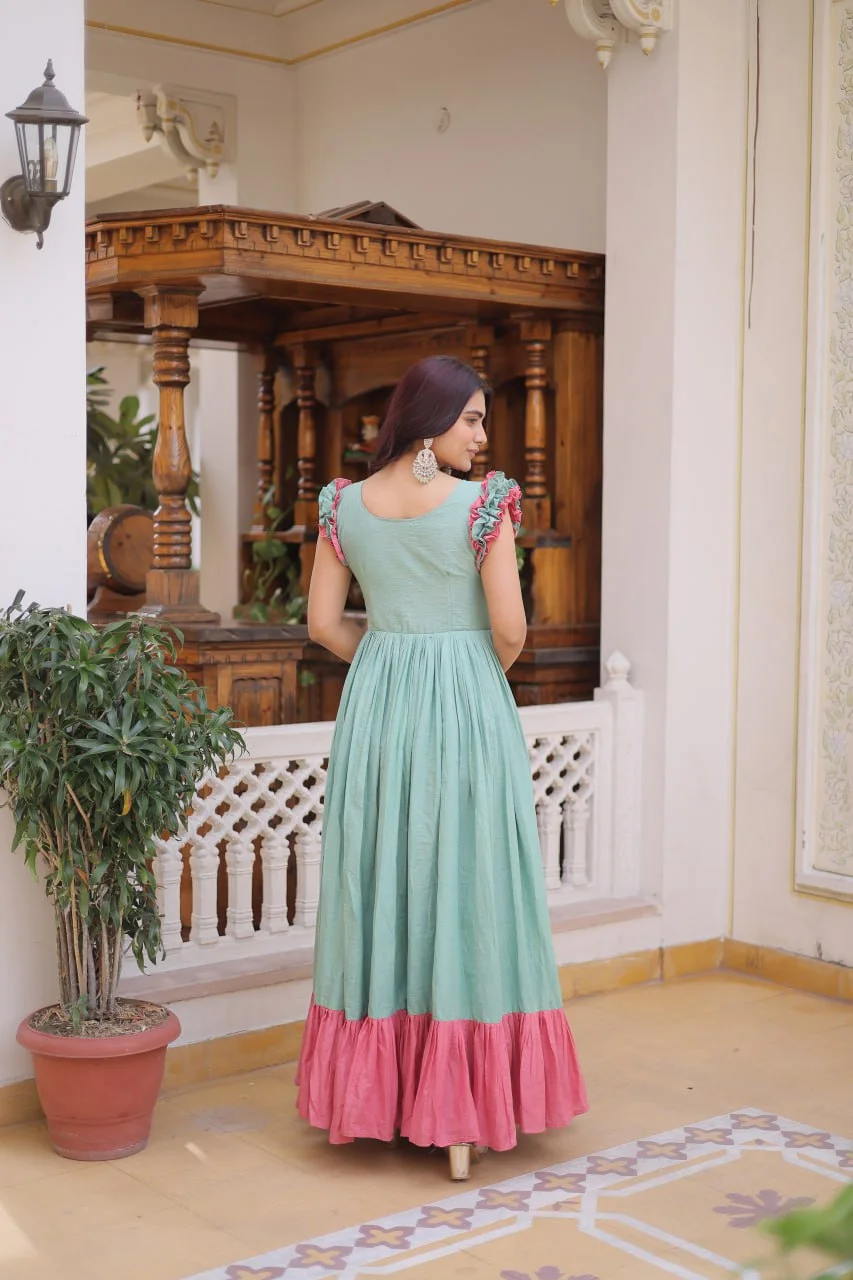 Party Wear Cotton Embroidered Gown with Double Frill Sleeves