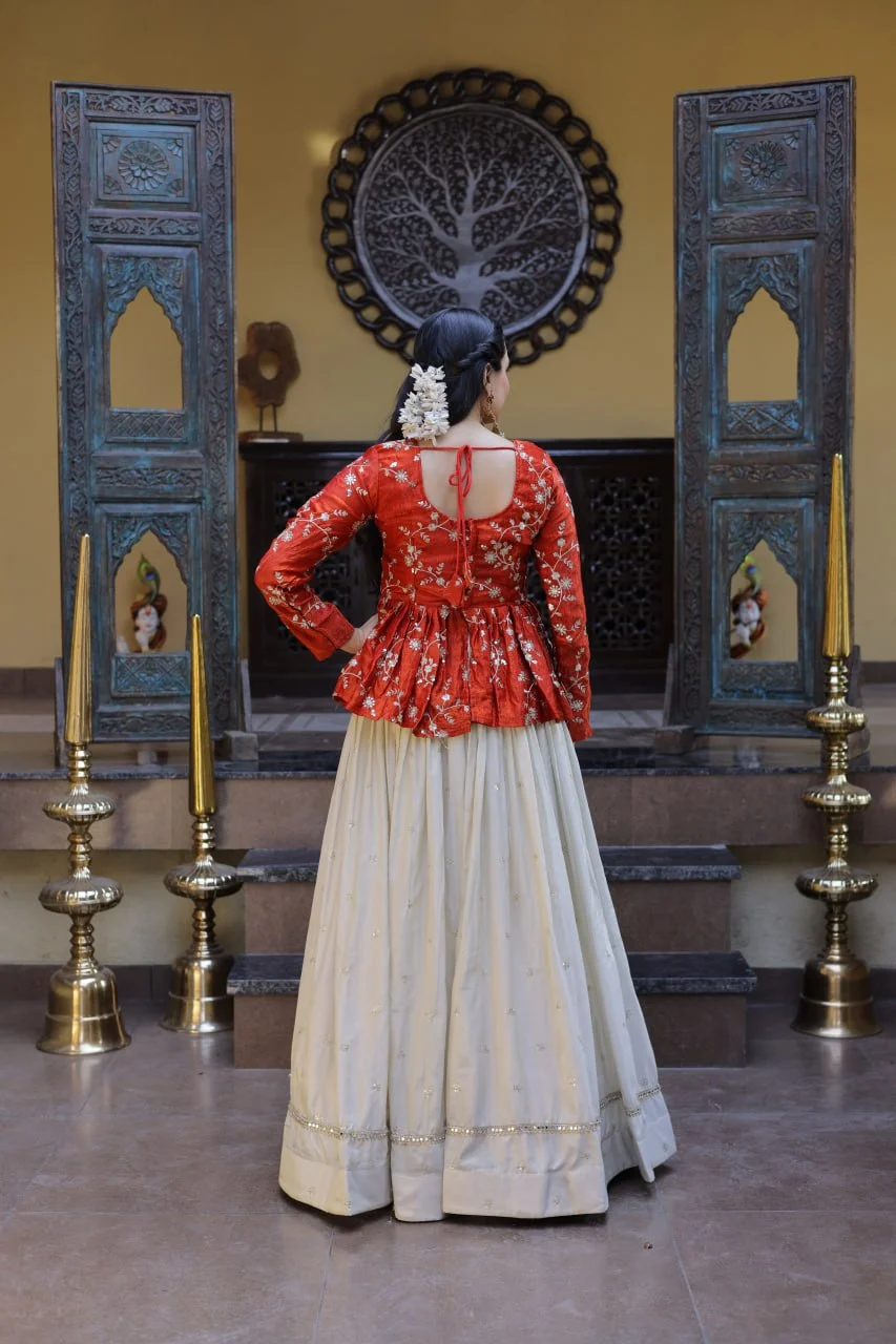 Be the first to review “Red Chinon Silk Peplum Kurti with Heavy Embroidery and Flared Lehenga Set for Women”