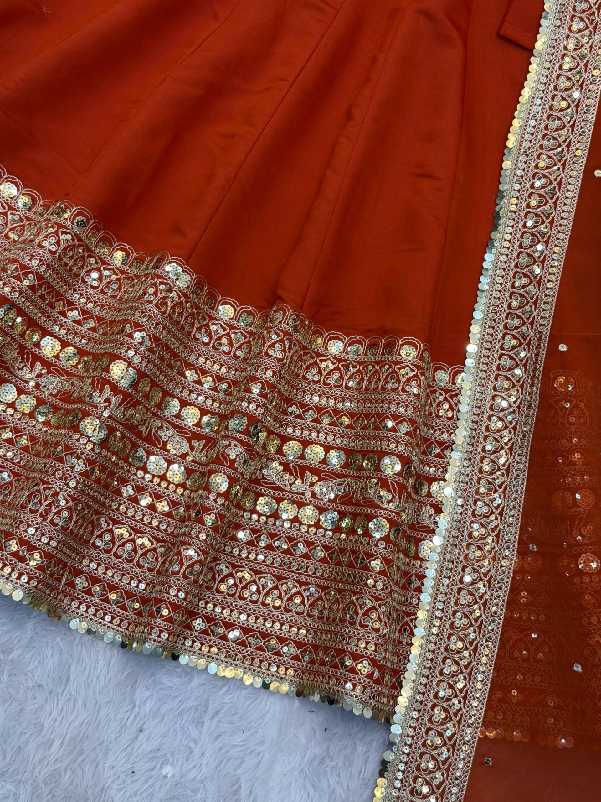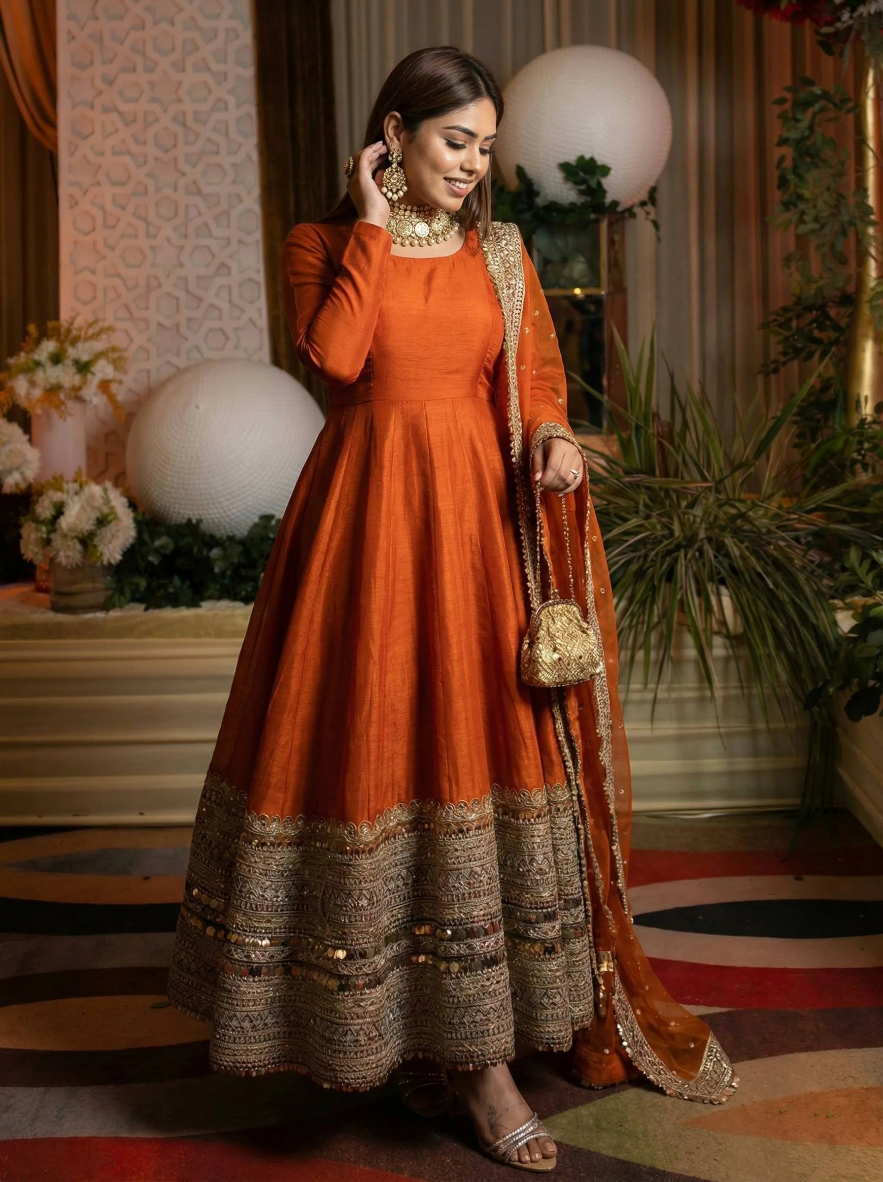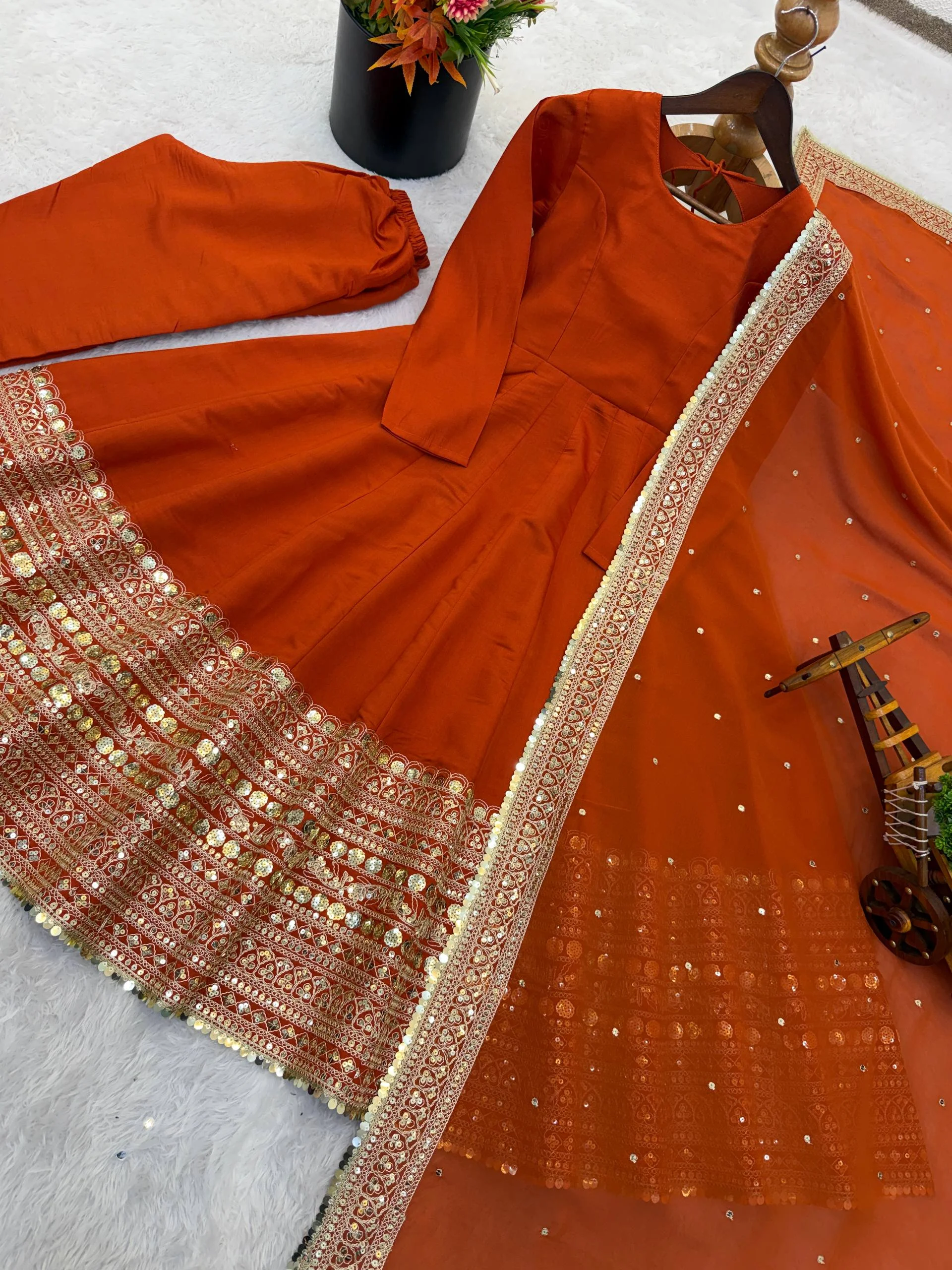 Stunning Orange Anarkali Gown with Coding Sequence Embellishment